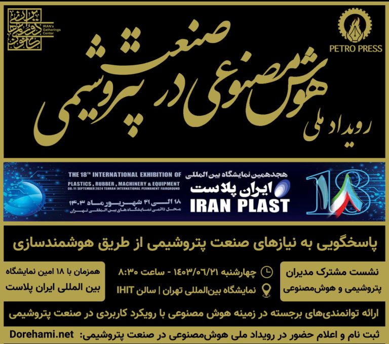 نخستین رویداد هوش مصنوعی در صنعت پترو شیمی همزمان با نمایشگاه بین المللی ایران پلاست در روز چهارشنبه 21 شهریور ماه از ساعت 9 صبح در سالن IHIT برگزار شد .  در این رویداد فعالان حوزه هوش مصنوعی و مدیران صنعت پتروشیمی به ارائه فرصت ها و نیازها پرداختند .